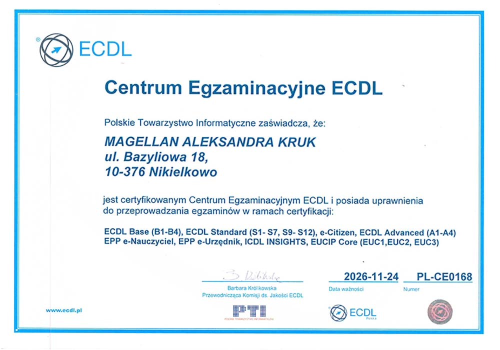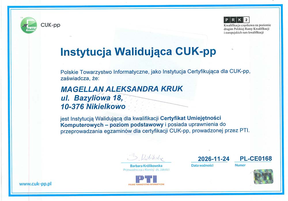 Pełnimy rolę Instytucji Walidującej dla kwalifikacji Certyfikat Umiejętności Komputerowych. Jesteśmy uprawnieni do przeprowadzania egzaminów dla certyfikacji CUK-pp prowadzonej przez PTI.